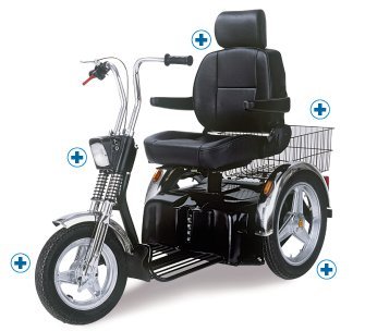 The classic scooters offer the perfect combination of comfort, classic design, and reliability. Available in Black & Chrome color. Variable speed up to 9.3 mph. Max load capacity 500 lbs.